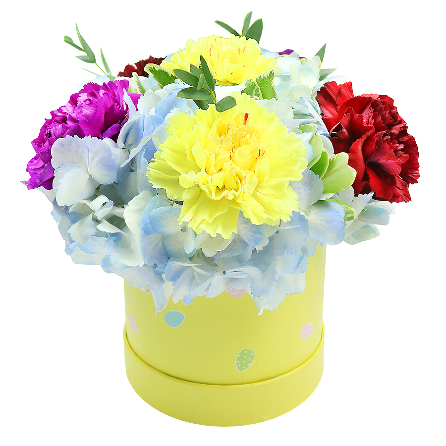 Experience the charm of our Bliss Floral Arrangement, a beautifully designed bouquet featuring cheerful colors of red, purple, and yellow carnations complemented by blue hydrangeas and vibrant greenery. This unique design is perfect to uplift any spirit.