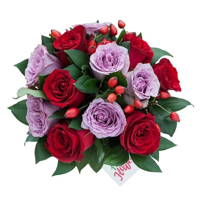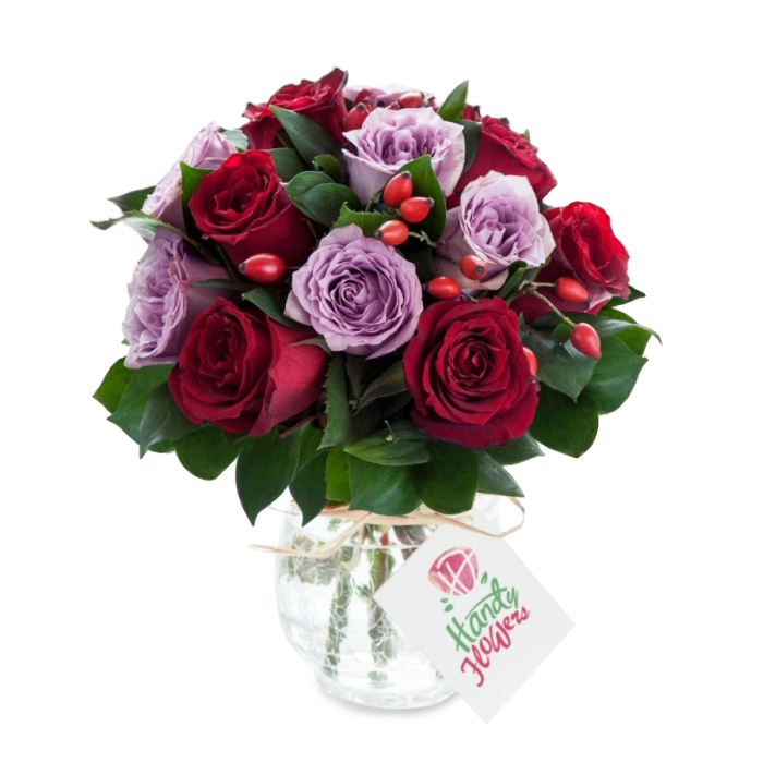 Experience the grace and intensity of our stunning bouquet, featuring a harmonious blend of velvet and purple roses that stand out in any setting.