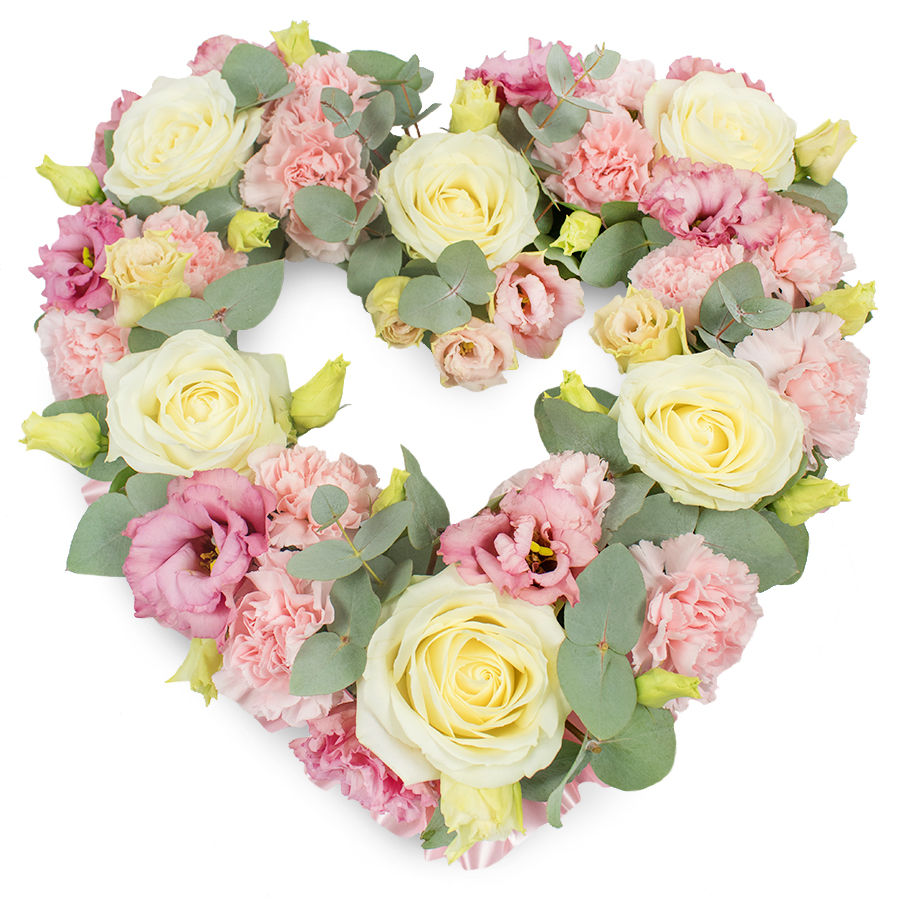 Honor and remember with our graceful open heart memorial bouquet. This sophisticated arrangement combines white roses, pink carnations, elegant pink lisianthus, and fragrant eucalyptus leaves, artfully arranged to create a touching tribute.