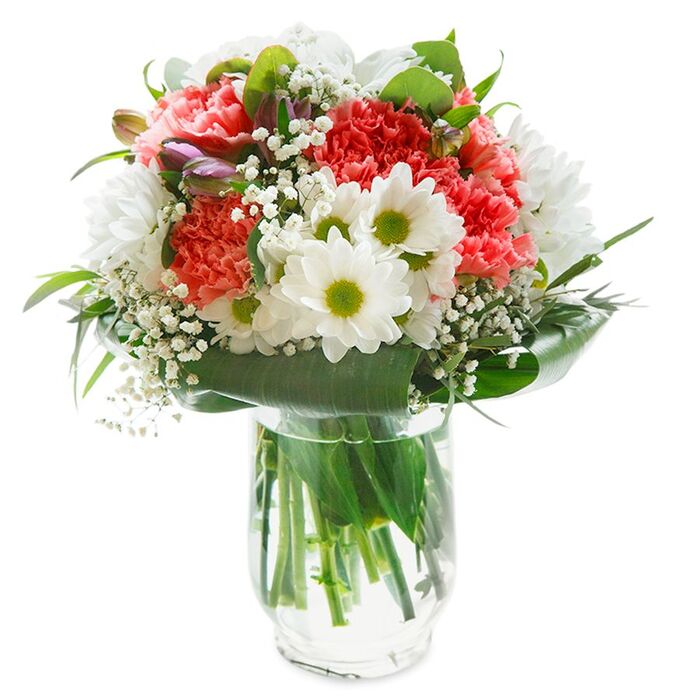 A soft, joyful energy rises from this signature Cockfosters bouquet, as if the first days of spring have been woven into every fold of petal and leaf. Ruffled coral and deep red carnations glow with warmth and texture, evoking the romance of nearby Trent Park's gardens. Pure white daisies, shining with vibrant golden-lime hearts, add zesty happiness to the composition, while a flurry of feathery baby's breath brings a gentle, uplifting lightness throughout. Hidden among the blooms, a handful of purple-tinged unopened buds offer an enchanting note of suspense, suggesting that greater beauty is waiting just beneath the surface. Framing the floral display is a cascade of deep green foliage, its broad leaves gleaming softly as they arch to support the vibrant arrangement. The bouquet, nestled confidently in a smart white gift bag with ribbon handles, feels ready for a special Cockfosters moment-be it a birthday, anniversary, or simply to mark a new chapter. Every element is thoughtfully placed, echoing the care and creativity of local Cockfosters florists and the unique freshness of flower delivery in North London's greenest corridors. This meticulously arranged bouquet brings together the spirit of Cockfosters and the poetry of spring. The bright, sunlit white daisies with their lime centres gather attention at the core, while coral-pink carnations add joyous, pillowy layers-each ruffle a note in nature's harmonious chorus. Lightly scattered gypsophila resembles a soft flurry, its dreamy presence reminiscent of Cockfosters' peaceful green spaces, while gently hidden alstroemeria buds blush with purple and rose, hinting at surprises yet to bloom. Silvery eucalyptus and a frame of deeper greenery lend a fresh, aromatic background, the foliage's textures balancing the vibrant floral display. This rounded, exuberant composition is expertly designed for Cockfosters households marking milestones or delivering smiles, bringing a tranquil yet uplifting energy to breakfast tables, birthday celebrations, or office desks across the area. Every stem, hue, and petal is thoughtfully chosen to capture the warmth and artistry found in Cockfosters' beloved flower shops. Bursting with gratitude and hope, this vibrant bouquet gathers the spirit of Cockfosters into a single expressive composition. At its core, coral-pink carnations fan outward, each ruffled bloom full of cheerful energy and rich texture. Around them, snowy white chrysanthemums and small white daisies pulse with innocence and joy, their soft yellow-green eyes recalling Sunday strolls near Cockfosters Green. Airy clusters of baby's breath meander between the main flowers, introducing lightness and a hint of wild beauty. On the left, tightly closed magenta alstroemeria buds promise unfolding colour-a subtle reminder of seasons changing along the local streets. The ensemble is cradled by glossy, deep green and slender leaves, providing both support and a vivid foundation, much like the tree-lined paths leading to Trent Park. Set with care in a clear glass vase, the stems stand in pure water, underscoring the freshness of local, same-day delivery. A crisp white background and luminous, even illumination draw focus exclusively to the bouquet, allowing every petal, leaf, and hue to be savoured. Whether celebrating a birthday, sending encouragement, or simply adorning a kitchen window, this Cockfosters Flowers design brings uplifting beauty and genuine care to any home.